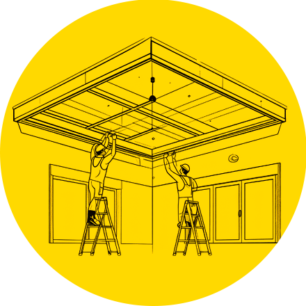 Plafonds suspendus/tendus, isolation, encastrement de spots, structuration intérieure.